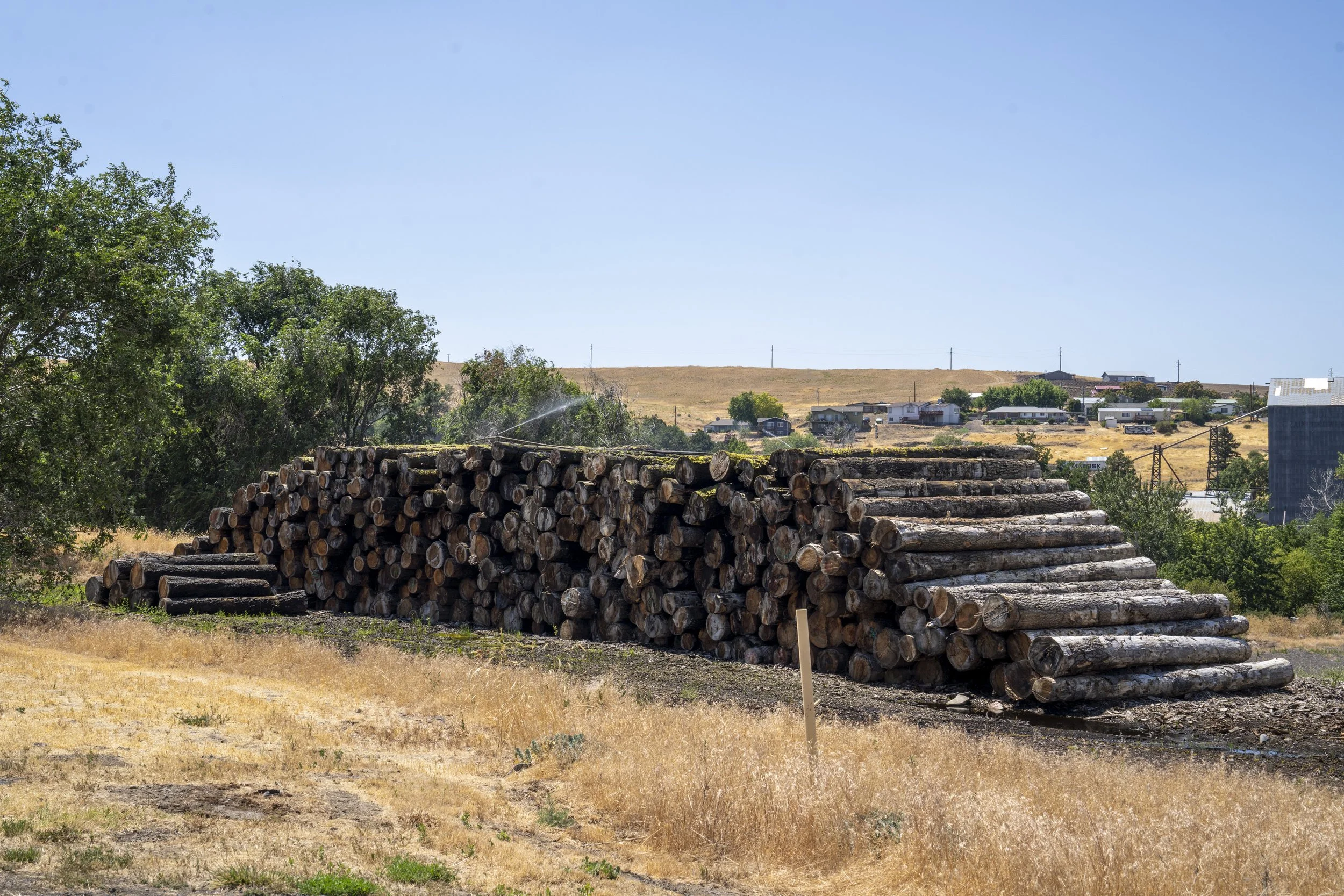 Logs of wood lay under sprinklers July 11, 2025, at Woodgrain sawmill in Pilot Rock. Woodgrain announced July 1 it will shut the mill down in the fall. Berit Thorson/East Oregonian